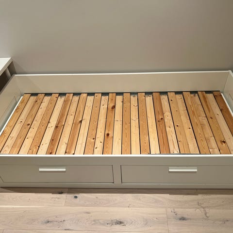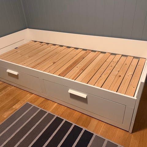 Selger en Brimnes uttrekkbar dagseng som er godt, men pent brukt. Har to skuffer for oppbevaring. Sengen er solid, funksjonell og har normal bruksslitasje med kun et par bruksmerker (ref bilder) som enkelt kan flekkmales . Har vært brukt i røykfritt hjem.