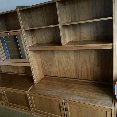 Hylle i tre med to åpne rom og en skuffe med front i rotting. Passer til oppbevaring og dekorative formål.