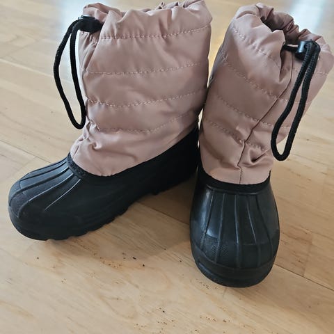 B barnestøvler i størrelse 32 for jente. Støvlene har en blank, metallisk overflate og er utstyrt med snøring for justering. Sålen har et mønster for grep. Passer til kaldt vær og utendørs bruk.