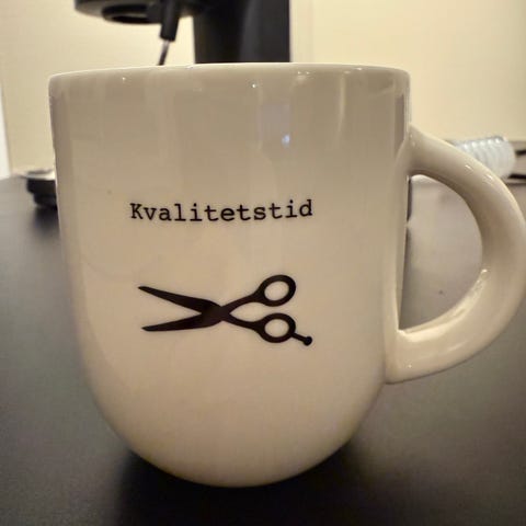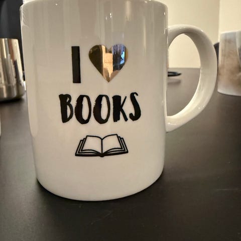 Kaffekopp med teksten «I ❤️ books» hvor hjertet i gull er chrome med en speileffekt.