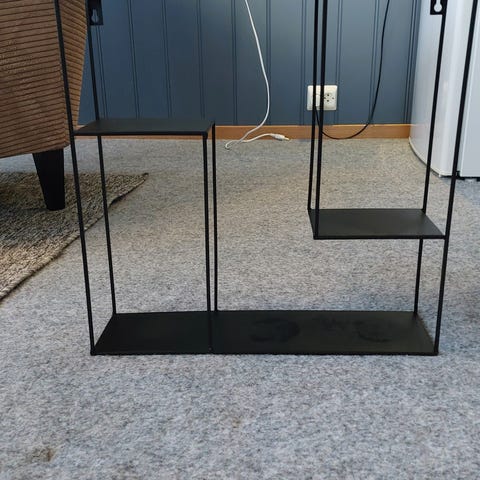 Fin pyntehylle i sort metall med treplater selges billig. Må hentes på Kvernaland.