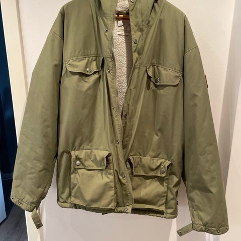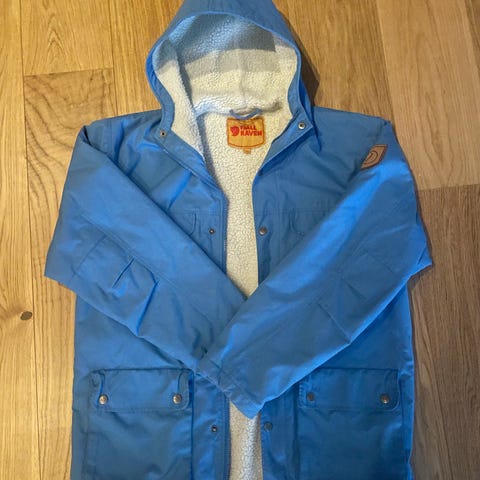 Fjällräven jakke i blå farge, størrelse S, laget av bomull. Jakken har flere lommer og knappelukking, samt hette. Egnet for utendørs bruk.
