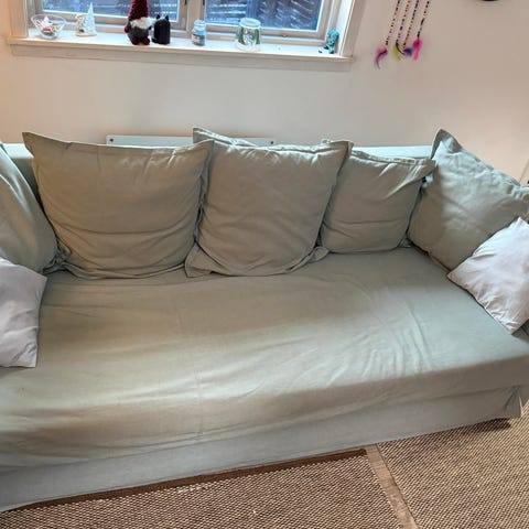 Jeg selgere denne fine lyseblå sovesofaen med tungt hjerte grunnet flytting. Denne fargen selges ikke lenger og nypris var 6495,-. Prisen kan diskuteres! Den er tre-seters, har oppbevaringsplass under setene, kun 1,5 år gammel, pent brukt & nylig dampvasket. Avtagbart trekk kan vaskes i vaskemaskin.