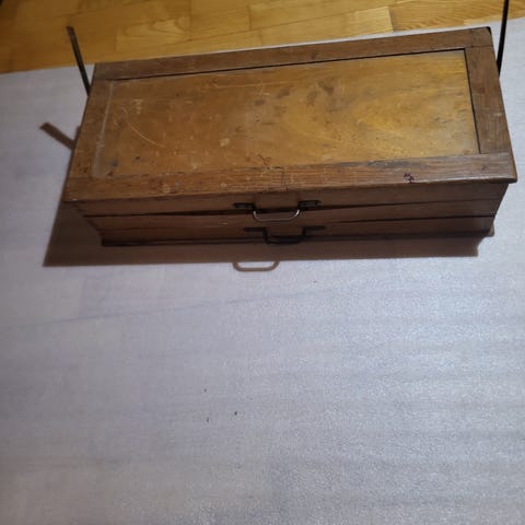 Ekdte sett med tilsammen 19 jern/ kniver for treskjæring. Dvs 19 av 21 plasser er fylt. Stål merket Taylor England på de aller fleste, noen merket kun med England. Tror de fleste jern er originale, men noe kan være byttet av jern og skaft. Jernene ser alt I alt ut til å være av god kvalitet. Reiseskrinet er fortsatt brukbart, men preget av alder og med litt kjellerlukt. Kan gjerne besigtiges hjemme hos oss Seriøse prisforslag mottas