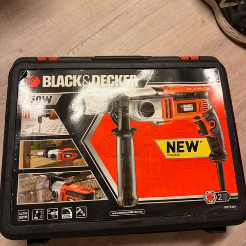 Black & Decker KD975KA slagbormaskin. Leveres med ekstra håndtak, chucknøkkel, samt et sett bor og meisler i ulike størrelser. Egnet for boring og meisling i forskjellige materialer.