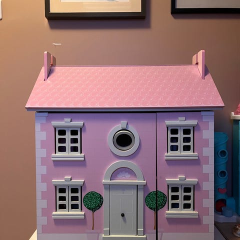 Lundby dukkehus med flere rom og møbler. Dukkehuset har vinduer som kan åpnes, og inkluderer små møbler og figurer for lek. Passer for barn som ønsker å leke med dukker og små interiørdetaljer.