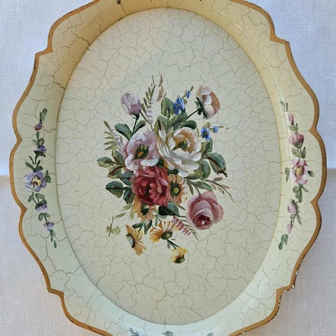 Gammelt, vintage metallbrett sort med roser. Bruksmerker på grunn av alder.