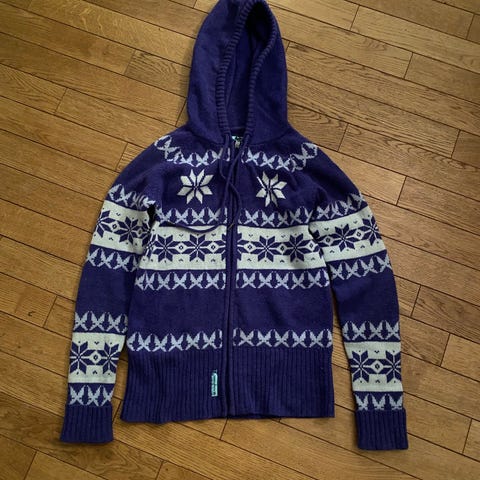 Kari Traa skigenser i størrelse S. Fin tykkelse. Genseren er blå med og lyseblått og oransje mønster rundt halsen