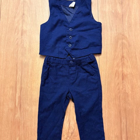 Mørkeblå dressbukse ogvest fra Name it. Str 80, 9-12 mnd. Pent brukt og i god stand. Jeg selger også en skjorte i str 80, se mine andre annonser.