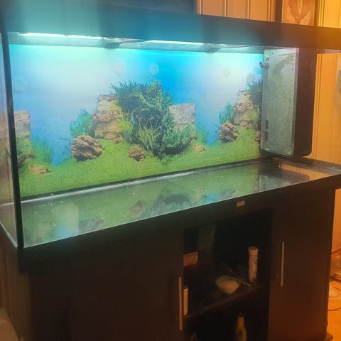 Selges høystbydende! Godt etablert akvarie. Mye utstyr. 2stk utvendig filtere, varmekabler, uv filter, lysstyring. Pyntevegg med filtermasse i bak kant. 8 stk gule ancisstrus, 1Stk sort ancistrus, 1stk torpedo barbe, 2stk maller og noen reker. Noe riper, men ikke veldig sjenerende. Har topplokk, men ene lysstoffrøret tenner ikke ordentlig.