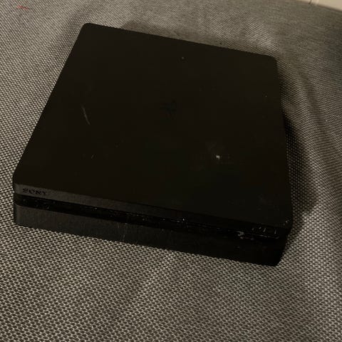 Sony Playstation 4 spillkonsoll i svart farge. Konsollen er designet for hjemmeunderholdning og spill, med støtte for digitale og fysiske spillformater. Passer for brukere som ønsker å spille Playstation 4-spill. Har en del spill som kan selges ved også