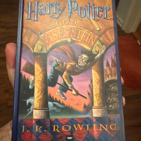 Harry Potter og De Vises Stein bok. Inneholder historien om Harry Potter, første bok i serien. Rød innbinding med hvit og gull tekst på ryggen.