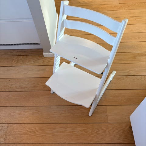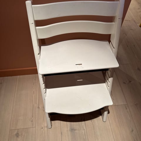 Stokke Høy barnestol i hvit farge. Stolen er laget av tre og plastmaterialer, designet for barn. Den har justerbar sitte- og fotplate for tilpasning til barnets vekst.