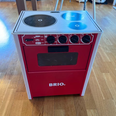 BRIO lekekjøkken i rød farge. Laget i tremateriale med hvite detaljer. Passer som leke for barn. Platen inni mangler, men den kan fikses av de som ønsker det.