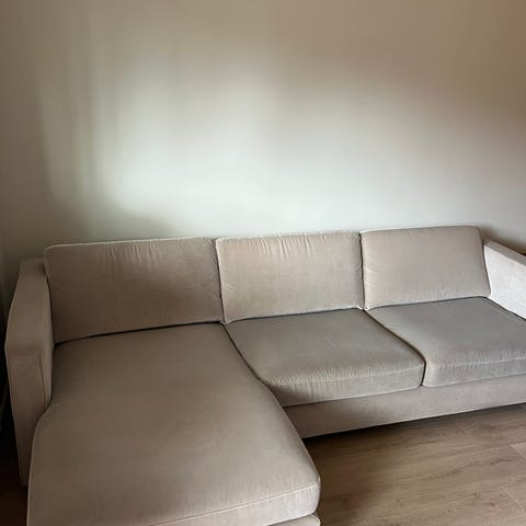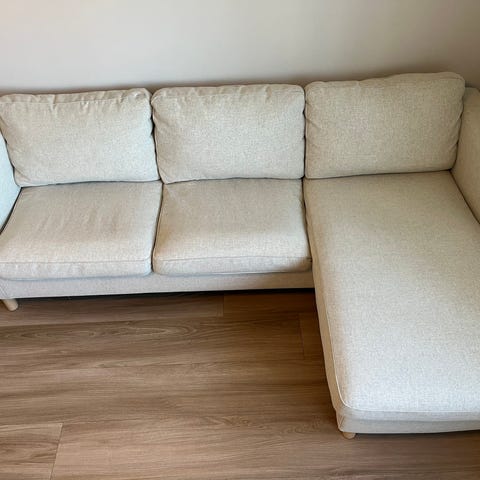 Super fin beige sofa selges. Den har opprinnelig bein i eik, men vi har foliert de svarte. Kan lett tas av.