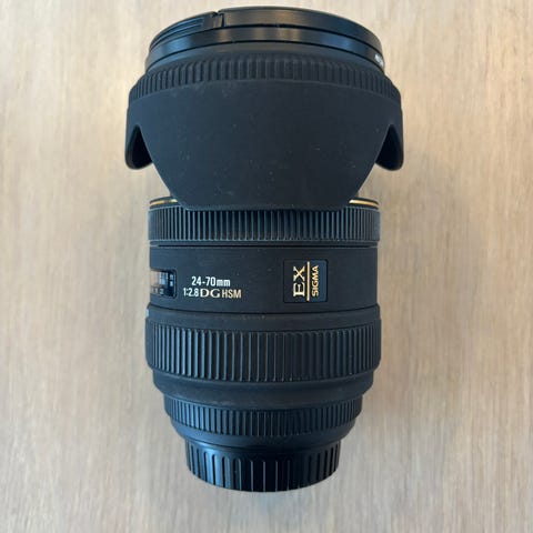 Sigma 24-70mm f/2.8 DG HSM EF objektiv med variabel brennvidde fra 24 til 70 mm. Objektivet har en maksimal blenderåpning på f/2.8 og er egnet for generell fotografering.