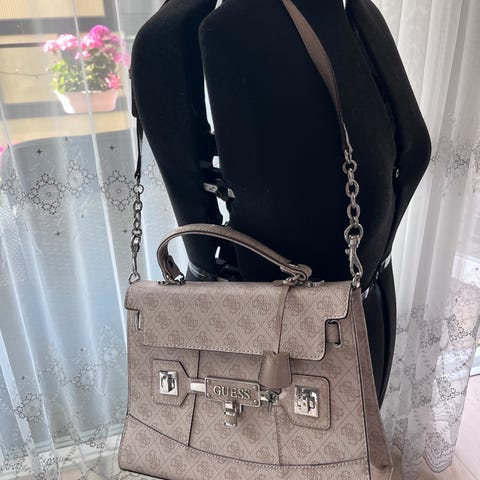 Guess veske. Vesken har et mønster med Guess-logo og detaljer i metall. Innvendig er den foret og har flere lommer for organisering. Vesken er i perfekt stand, utenom glidelåsen som trenger å fikses