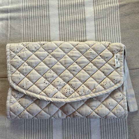Praktisk stelleunderlag med et fint, quiltet bølgemønster – ideelt for bleieskift utenfor huset. Det har en myk polstring for komfort, og ytterstoffet er coated for å være vannavvisende.