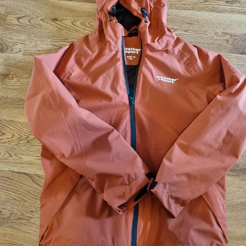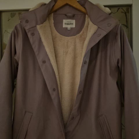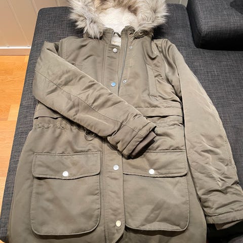 Hette med snøring, glidelås med magnetlukking utenpå, + magnetknapper på lommene. Mansjetter på ermene.