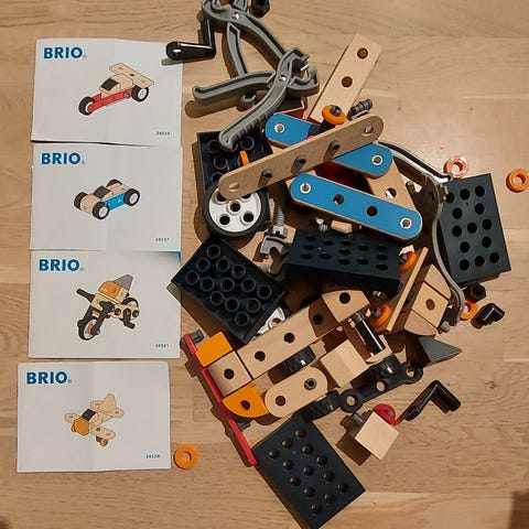BRIO Byggesett barn med 136 deler. Inneholder verktøy og byggekomponenter i ulike former og farger, egnet for barn.