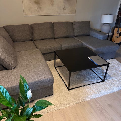 Stor og komfortabel U-sofa i mørk grå tone.