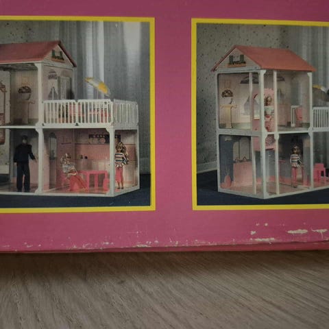 Et lite Barbie dukkehus i plast med flere rom inkludert kjøkken, bad og stue. Dukkehusets ytre har detaljer som vinduer og dør i rosa og hvitt. Inkluderer Barbie-dukke og møbler som vask, ovn, toalett, bord og stol. Passer til lek for barn som liker rollespill med dukker. Alt av utstyr på bildene følger med.