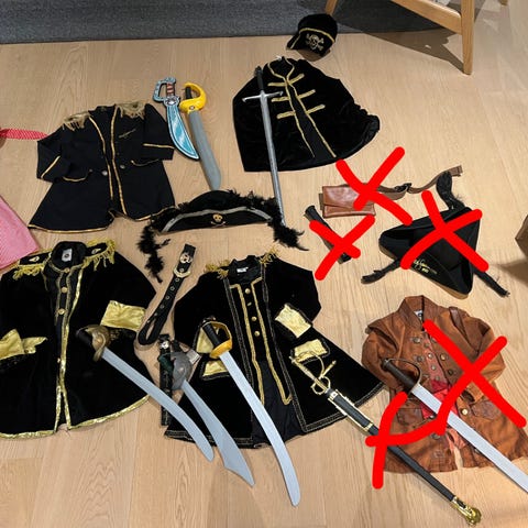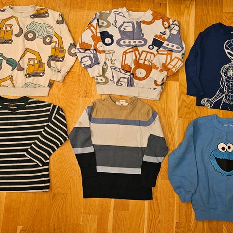 Selger en liten klespakke i str 110/116 med 5 langermede skjorter (hvorav 1 Ralph Lauren), 2 kortermede skjorter, 4 langermede t-skjorter, t-skjorte og singlet, stilongs og strømpebukser, 2 shorts og 1 joggebukse, 1 deilig ullfrottésett og 1 monsterbedriften pysj.