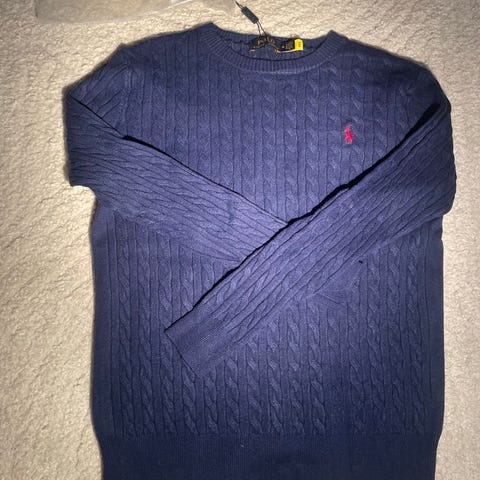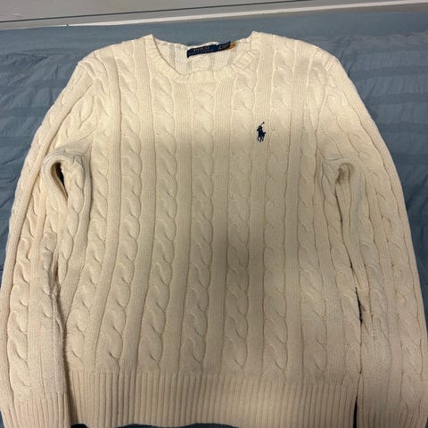 Ralph Lauren Polo genser i beige farge, laget av bomull. Genseren er i størrelse S men er får stor får meg så tenker at den passer får M til og med L. Modelen er designet for menn. Den har et klassisk flettemønster og rund hals.