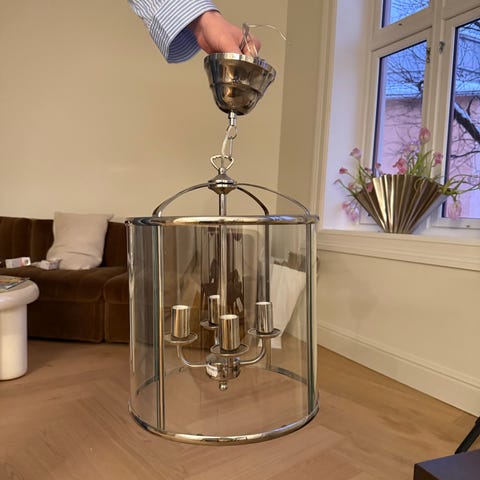 Lampen er i metall, og gir et mykt og grafisk inntrykk.