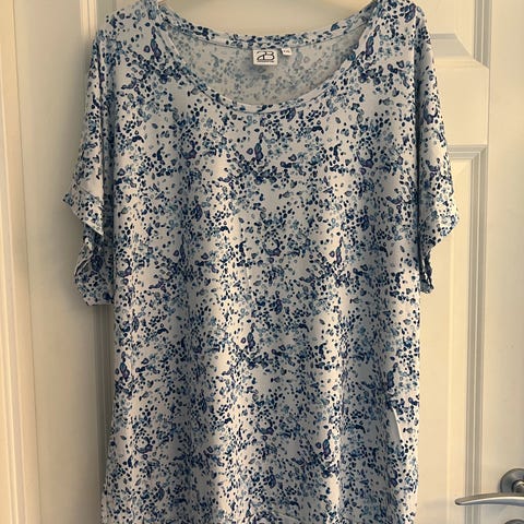 Topp fra 2 Biz som bare har hengt i skapet. Toppen er i 100 % viskose, har strikke i ermeavslutningen og nederst, den lukkes med en knapp bak i nakken (se bilde 2) og har en veldig pent snitt.