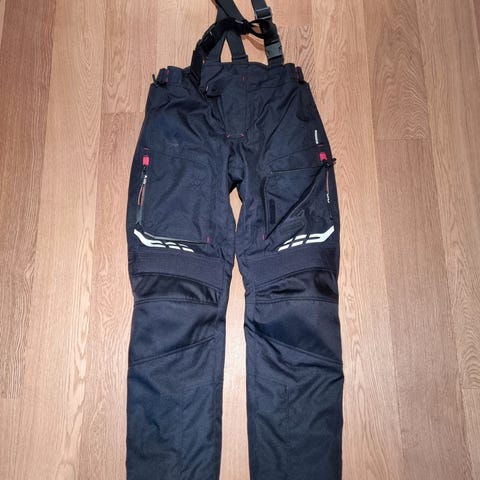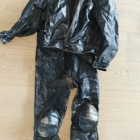 Dette er en veldig god kjøredress (jakken og buksen kobles sammen med glidelås i ryggen) som er så fin som ny. Den er vanntett når det regner og har masse lufte ventiler som kan åpnes når det blir varmt. Jakka har innebygd skuldre og albue beskyttelse samt ettermontert innebygd ryggskinne. Buksen har innebygd hofte og knebeskyttelse.