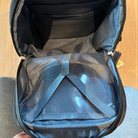 Beskytteren kan justeres i høyden og passer til de fleste bilseter. I tillegg til den store lommen finnes smålommer som lukkes med borrelåsbånd til smidig oppbevaring av småsaker.