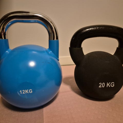 Kettlebell 24kg og 12kg og manualer på 25kg treningsutstyr