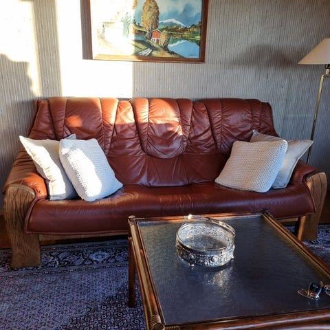 Pent brukt skinnsofa selges rimelig