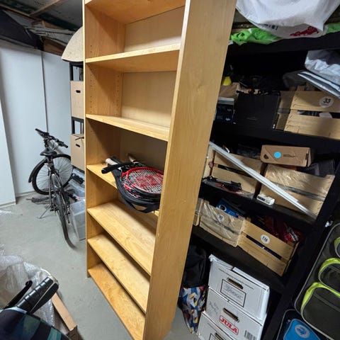 Usikker på hvor mange år gammelt. Et skruehull øverst på venstre vegg. Ellers ingen store skrammer utover normal slitasje på en gammel bokhylle som er flyttet litt hit og dit opp gjennom. Må hentes.