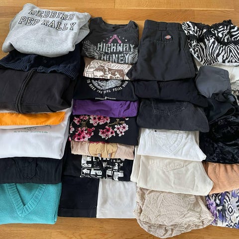 5 sekker med dameklær bukser, lin, jeans, jakker og kjoler. Str M og litt L