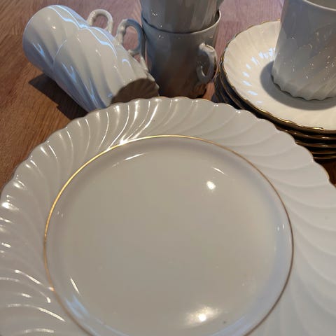 Kaffeservise fra Porsgrund porcelain. I god stand. Servicen består av: 4 kopper, 10 skåler, 10 tallerkener, en kaffekanne, en sukkerskål og en fløtemugge.