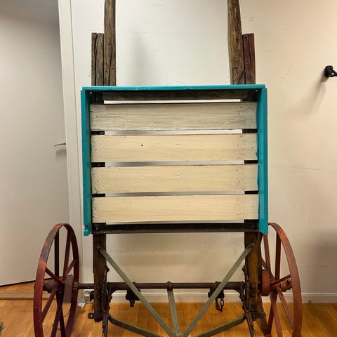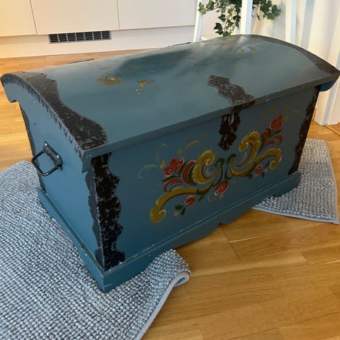 Malt trekiste, usikker på alder. Den er sliten og mangler håndtak på den ene siden. Har dessverre ikke nøkkel til den.