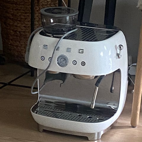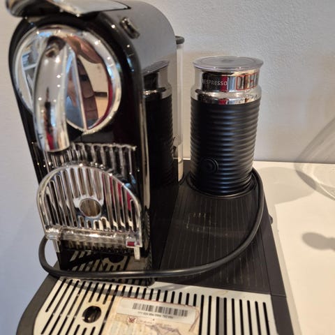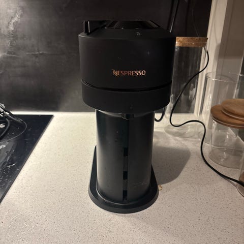 Nespresso kaffemaskin med svart design. Maskinen har en kompakt størrelse og er beregnet for bruk med Nespresso-vertuo kapsler. Den har en integrert vannbeholder og er utstyrt med ledning for strømtilkobling.
