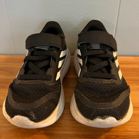 Adidas Runfalcon joggesko for jenter i størrelse 25. Skoene har vært reserve joggesko og fremstår derfor svært pene og lite brukt. Litt synlig i «fronten» av skoene at de har vært brukt og bitteliten fargeforskjell øverst bak på hælen. Dette er de eneste antydningene til bruksmerker jeg har sett.
