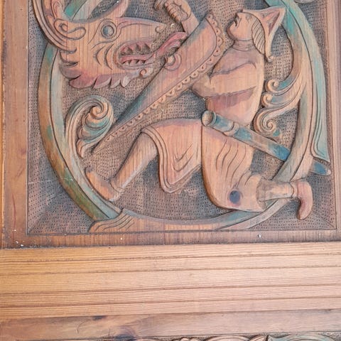 Utskjært i hardt treverk, muligens mahogny.