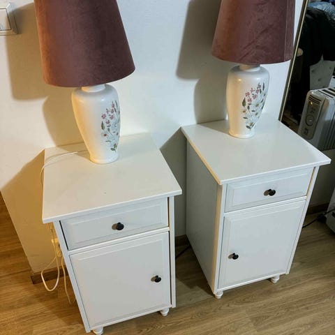 2 Nattbord i hvitt skinn. Chrome detaljer. Pris per stk