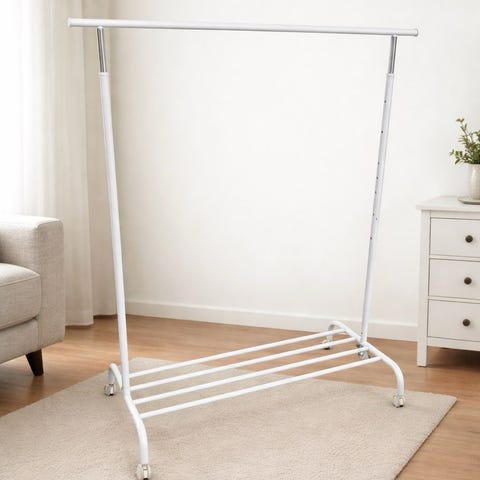 Kles stativ som man kan henge klær på, den har også et sted til skoene. Metall ramme, svart.