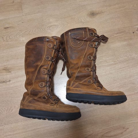 Timberland høye vinterstøvler. Vinterstøvler i ull i brunt/brunbeige. Lette og godt bevarte. Ekte semsket skinn med ull-/saueskinnfôr. Svært slitesterke, varme og komfortable.Støvle har snøring foran og metallfester for justering. Sålen har et mønster for godt grep. Størrelse 8W, som tilsvarer størrelse 40.