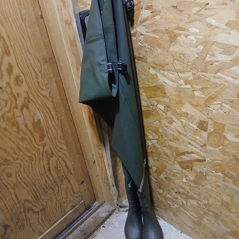 Viking gummistøvler med vadebukser i grønn farge, størrelse 41. Produktet kombinerer vanntette støvler med integrerte vadebukser, egnet for aktiviteter som krever beskyttelse mot vann og gjørme.