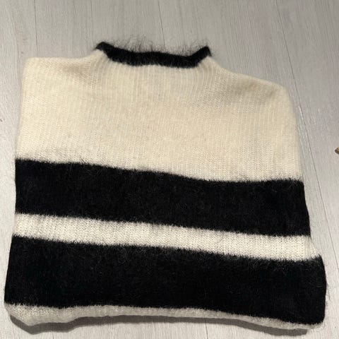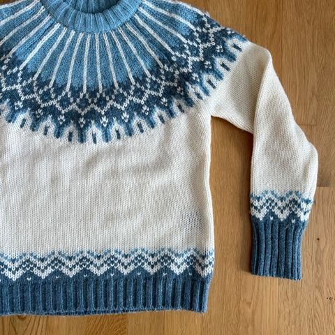 Olivengrønn strikket ullgenser i merket Blu, kjøpt på Vic. Veldig lite og pent brukt.