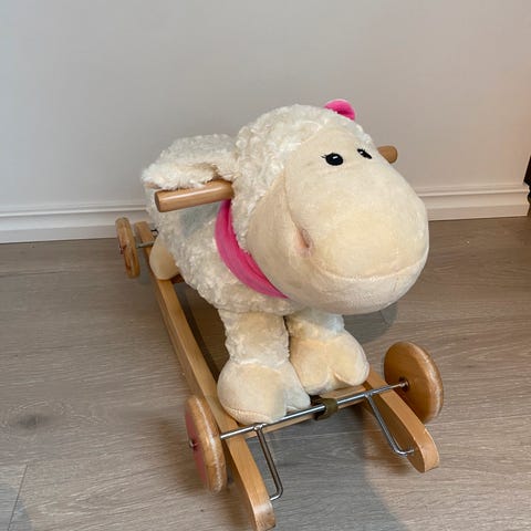 Godt likt solid gynge-sau søker nye barn i nytt hjem. Laget av tre, med mykt teddy stoff utenpå.