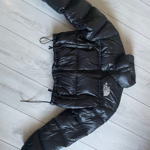 The North Face Vinterjakke i størrelse S for damer. Jakken er beige og laget av dunmateriale, designet for å gi varme i kalde forhold.