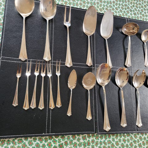 Prima Sølvplett/Nysølv bestående av tre små gafler og en stor gaffel. Gaflene har dekorative håndtak med mønster. Passer til bruk ved servering av småretter f. eks. Sylteagurk/Pålegg. Stor gaffel som Bestikk/ Kaker. Samleobjekt.