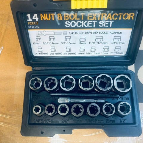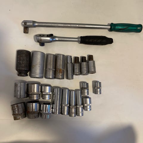 Verktøysett som inneholder skralle sett med ekstra forlenger 3/8 og 1/4 med piper fra Biltema, T håndtak 3/8 og 1/4 fra Bahco samt 3/8 latman fra Bahco, en tapetkniv, en spisstang fra Wurth, og en kort multiskralle 3/8 og 1/4.